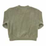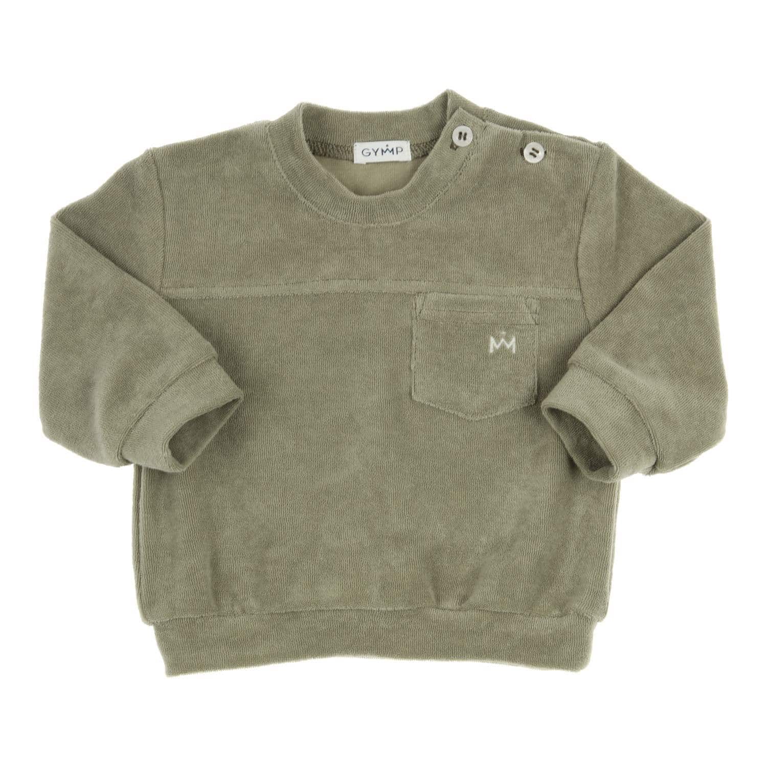 Khaki groene badstof sweater van Gymp (Ido) met drukknoopsluiting op de linkerschouder. Er is een bijpassend broekje bij en in dezelfde stof hebben we ook een polo en kort broekje.