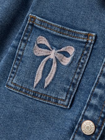 Hele leuke spijkerblouse van Name It (Devi) in medium blauwe wassing met roze geborduurde strikjes op de borstzakken.